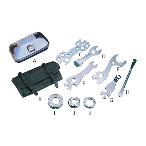 (A) Tool Box (B) Tool Bag PVC (C) 13 Hole Spanner (D) Tyre Lever Cum Spanner (E) 5 Hole Spanner (F) 6 Hole Spanner (G) 5 Hole Spanner (H) Tyre Lever (I) Nipple Key 8 Grooves One Way (J) Nipple Key 6 Grooves One Way (K) Nipple Key 8 Grooves Two Way